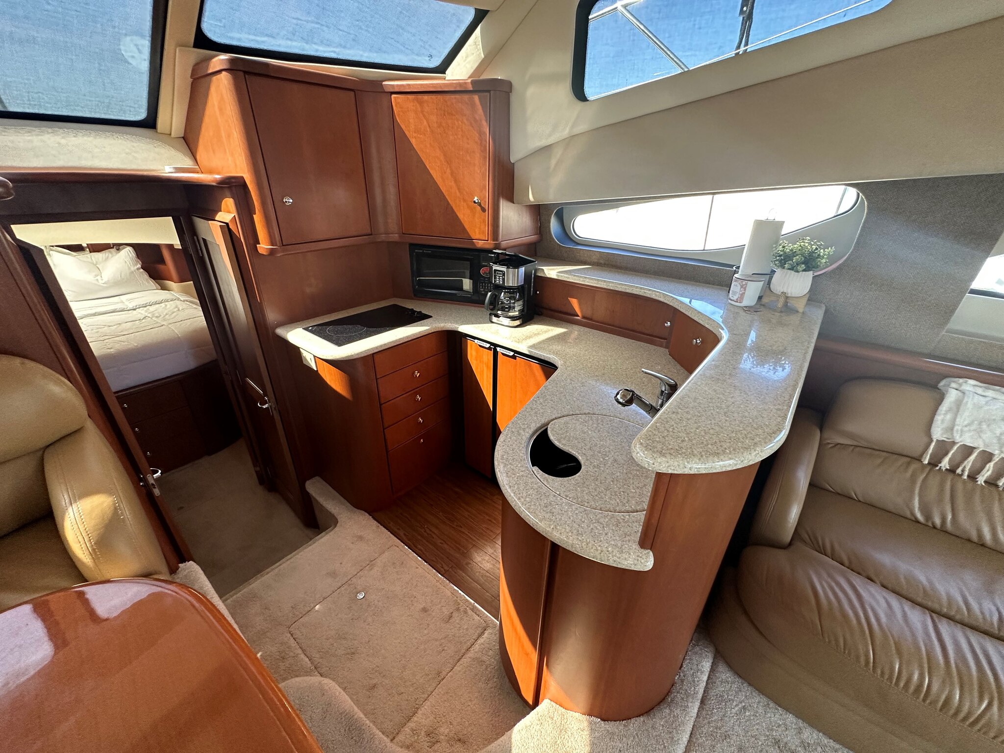 with Bose stereo. The galley has Corian countertops, a fridge, 2-burner stove, microwave, and a plethora of cabinet space.
