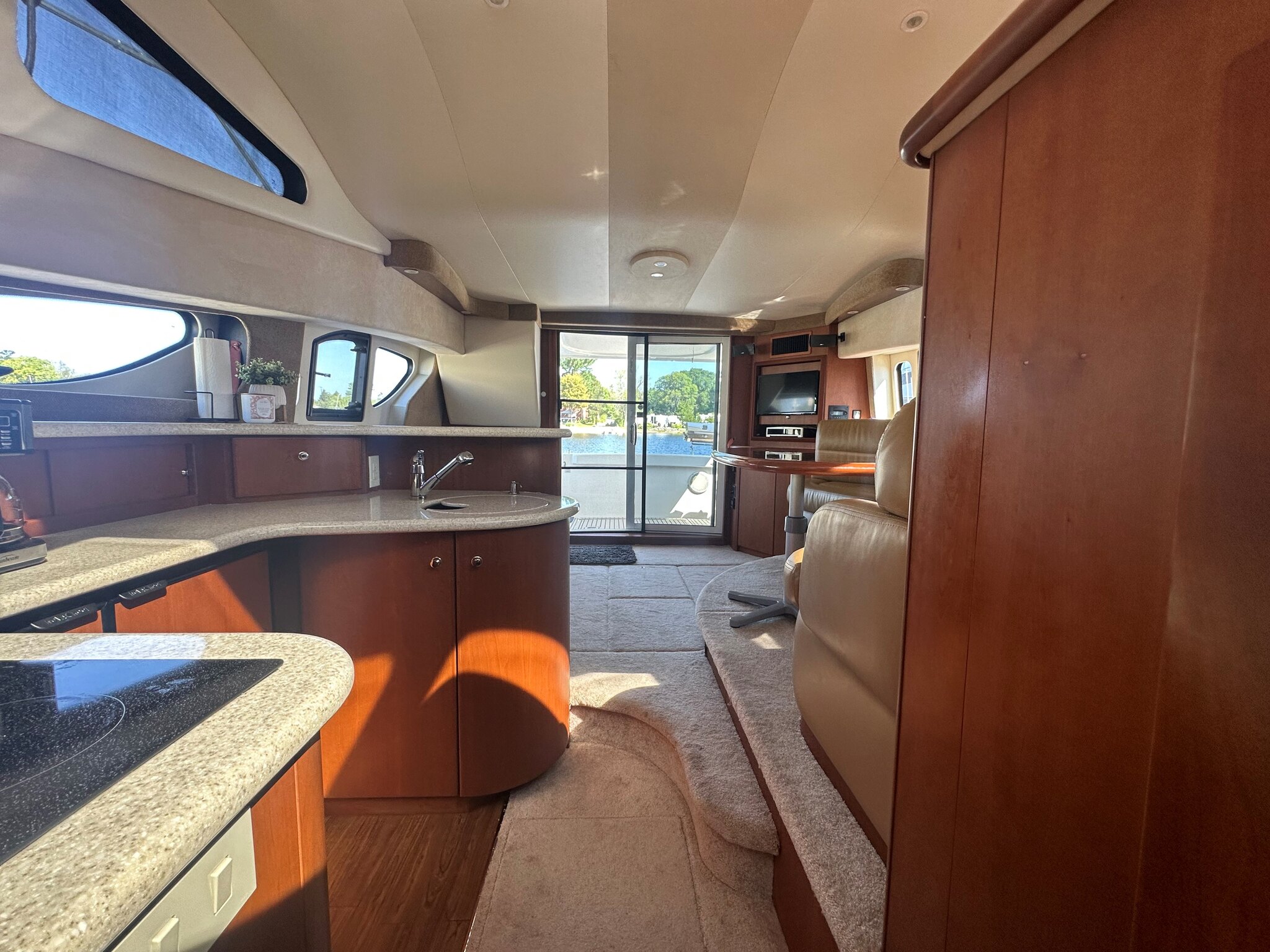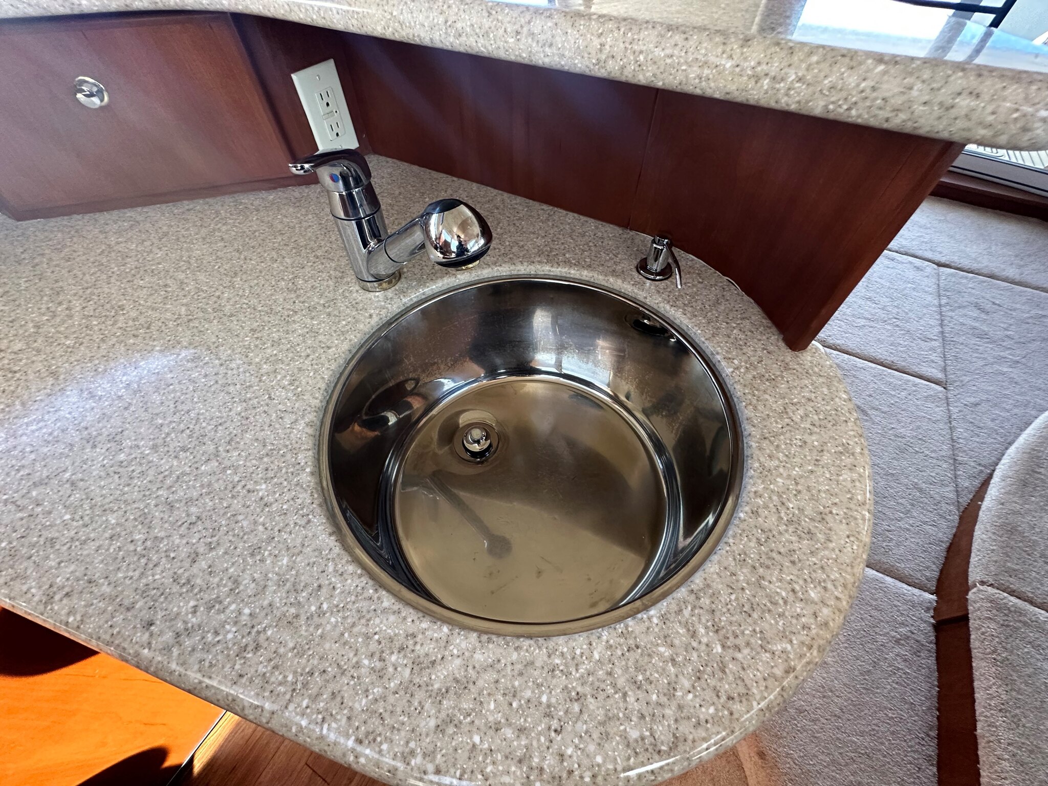 Inside the air conditioned cabin is a beautiful, cherry wood interior, salon furnishing a comfy sofa, dinette with wrap around seating, and a flat screen TV with Bose stereo. The galley has Corian countertops, a fridge, 2-burner stove, microwave, and a plethora of cabinet space.