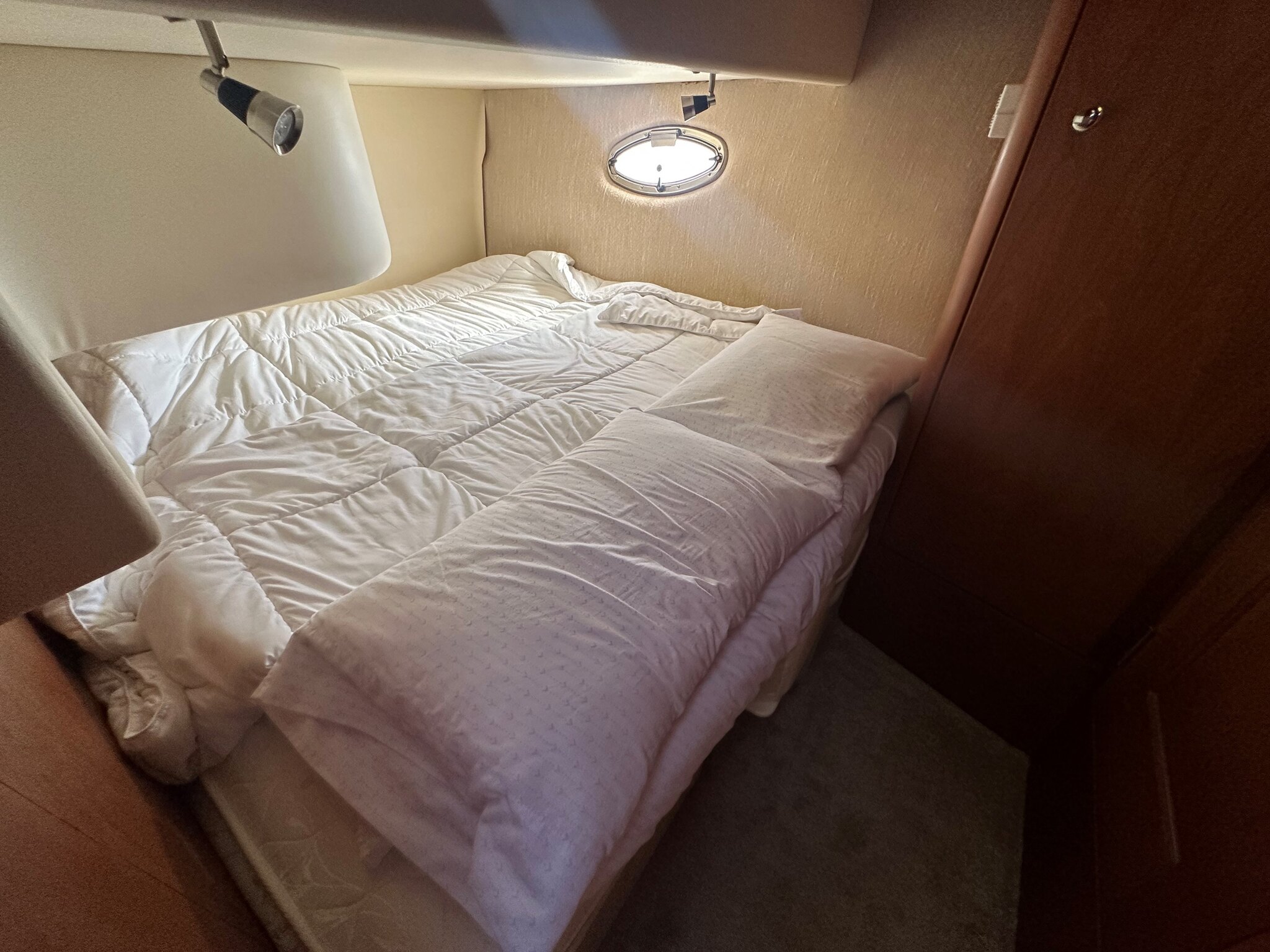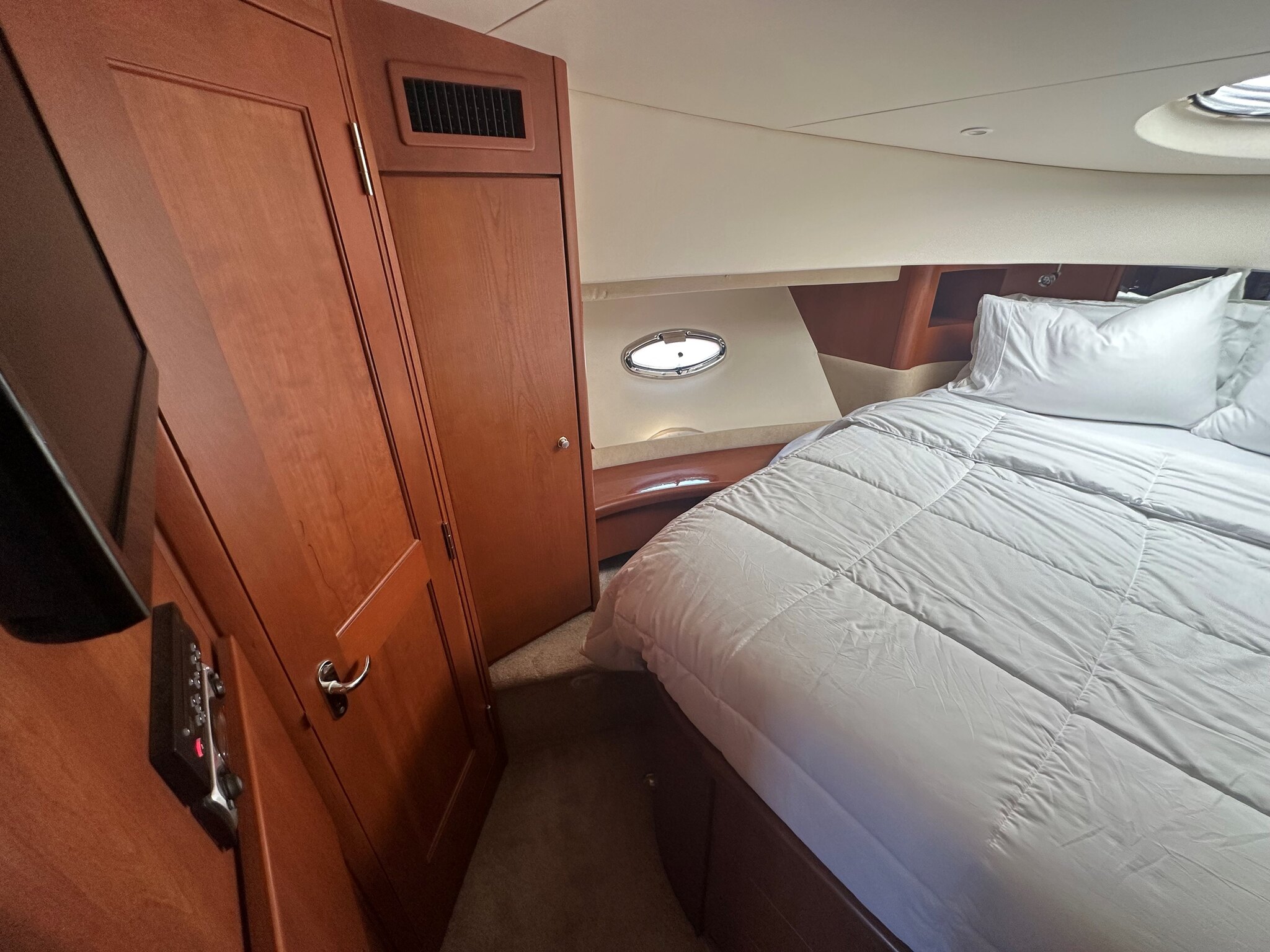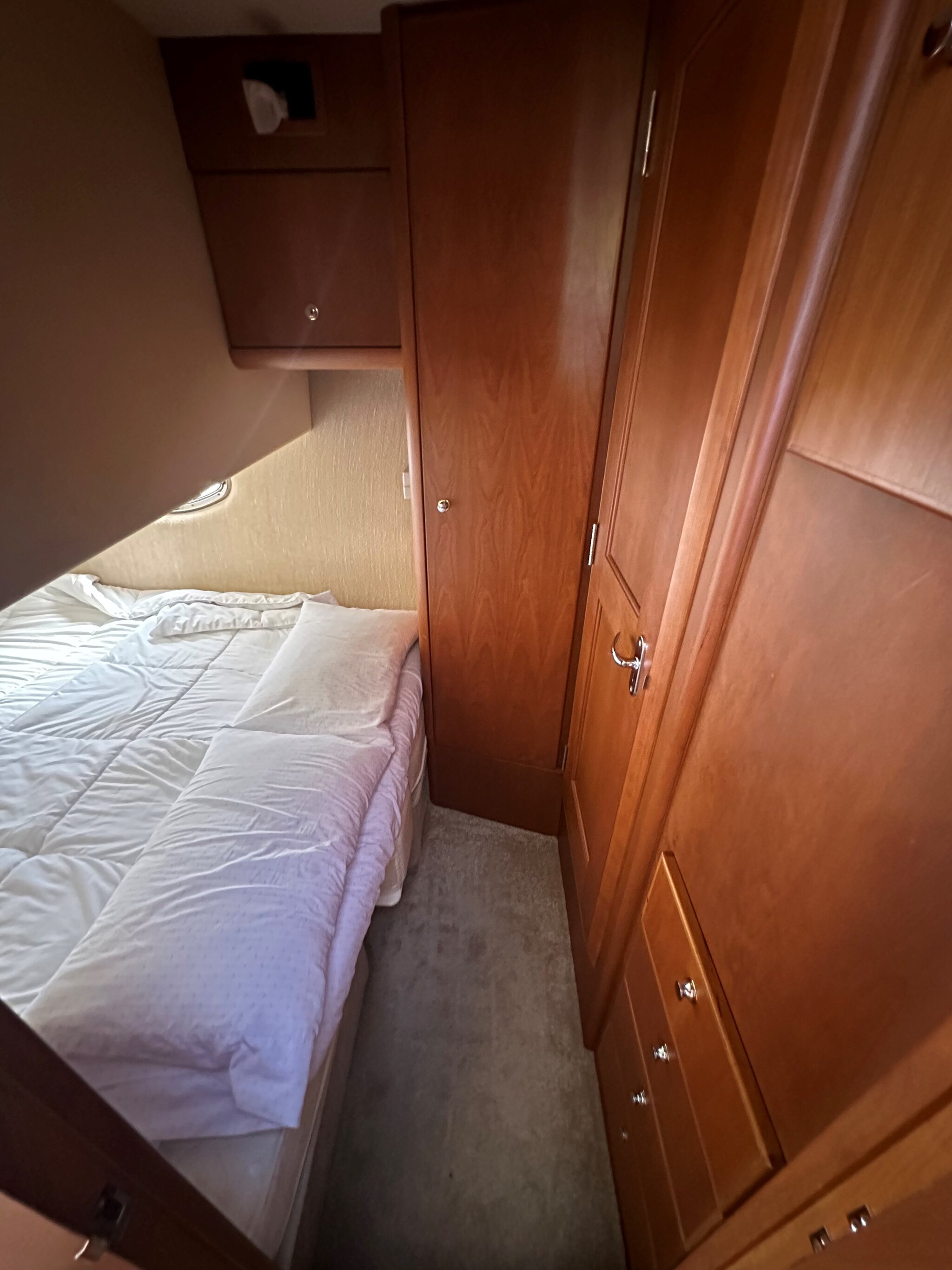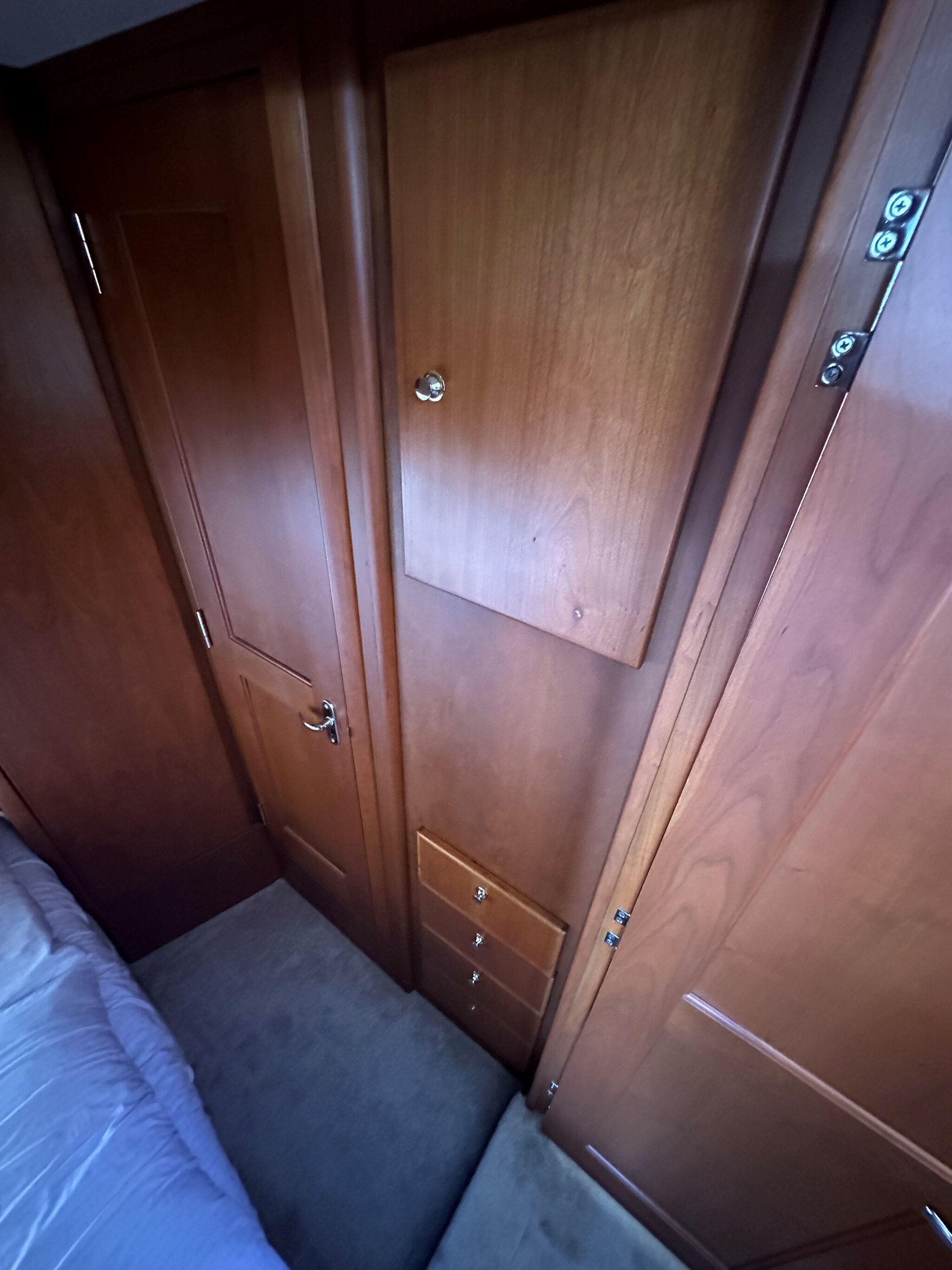 Toward the bow is a head (starboard), a guest berth, separate shower stall (port), and a v-berth featuring a TV and two Cedar hanging closets.