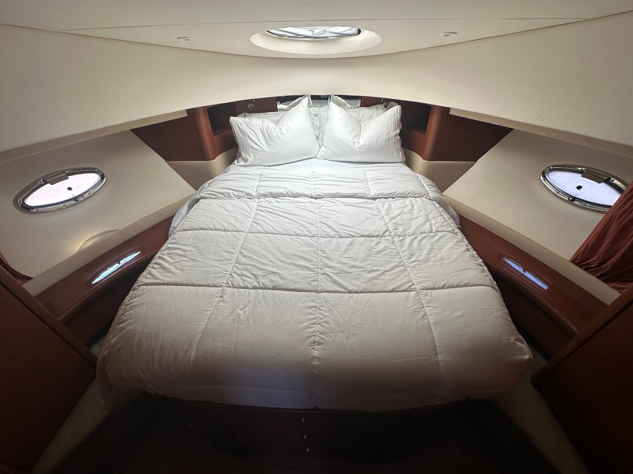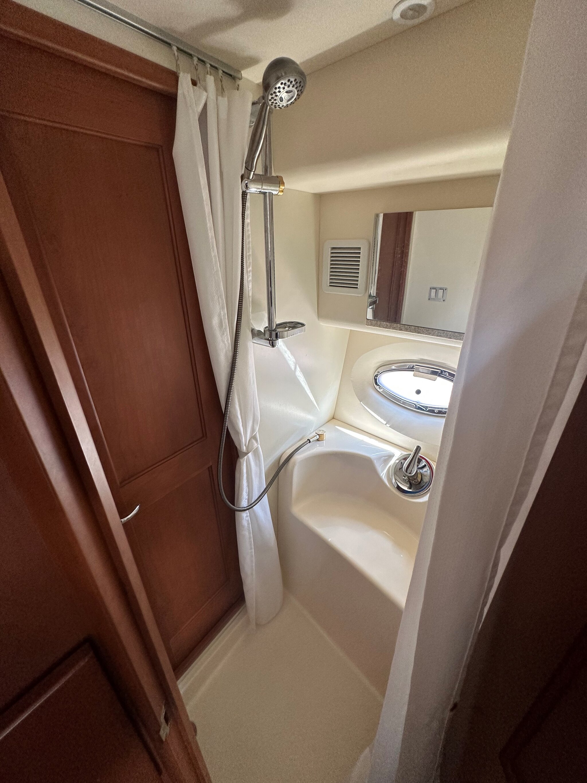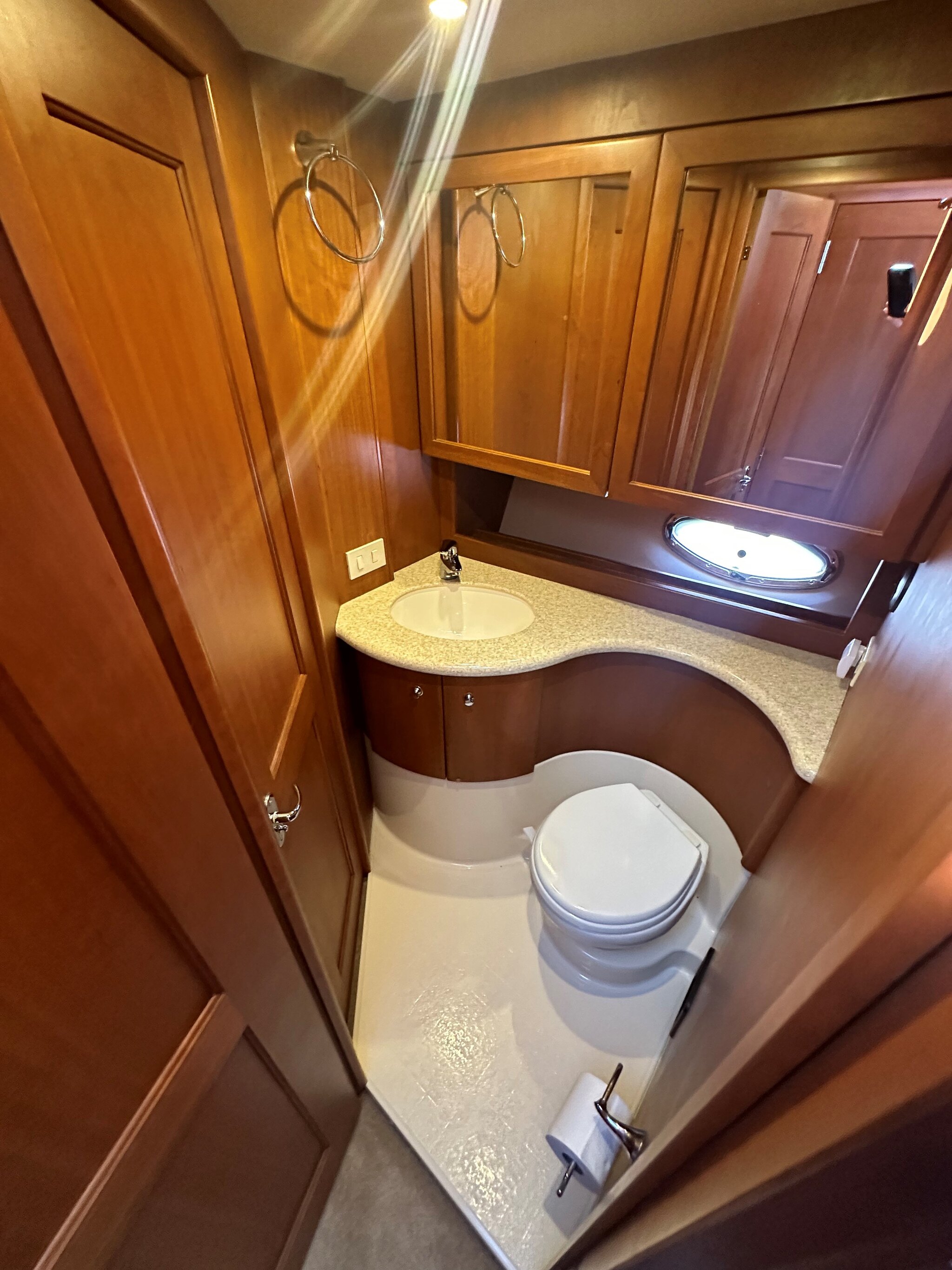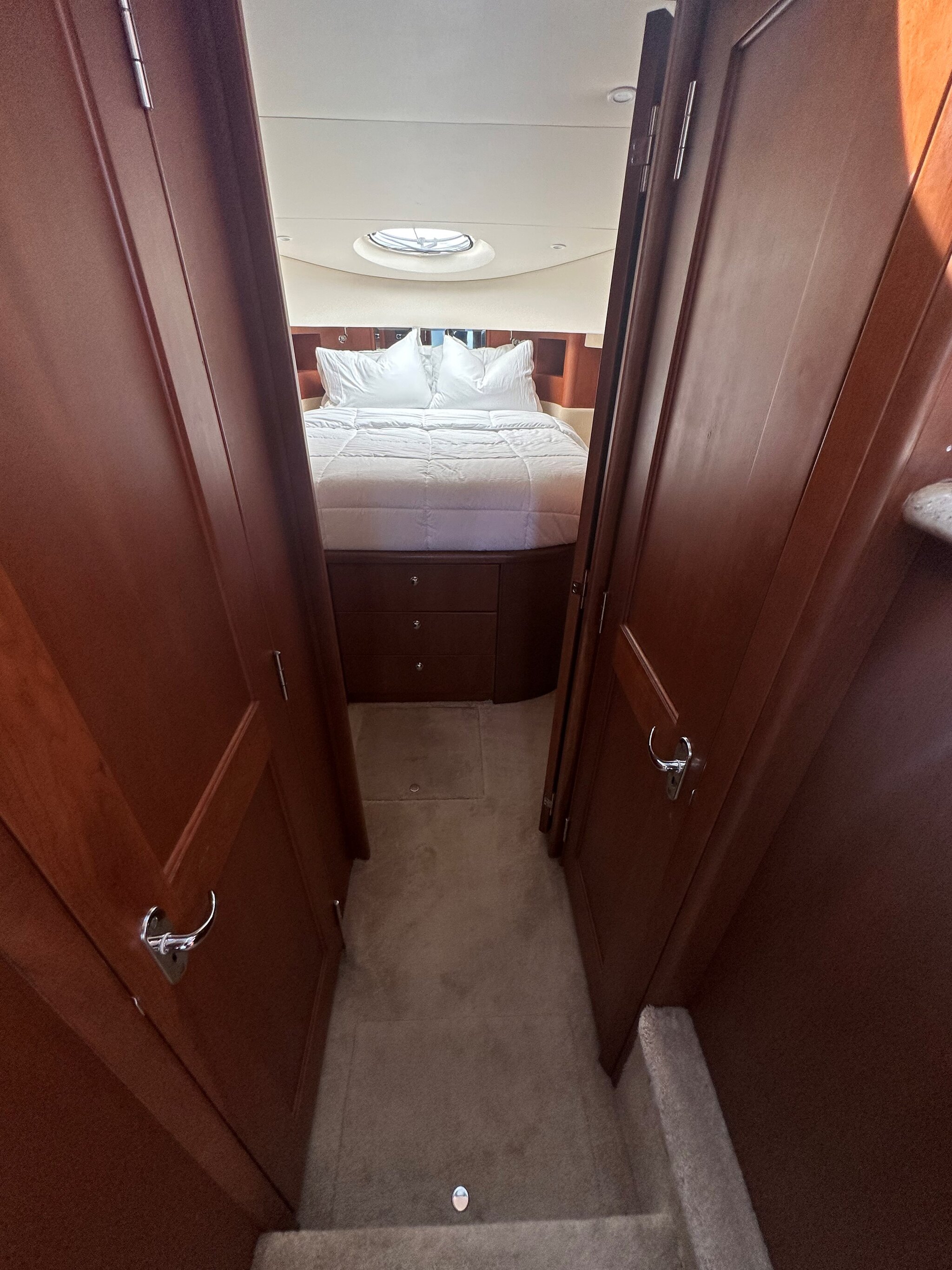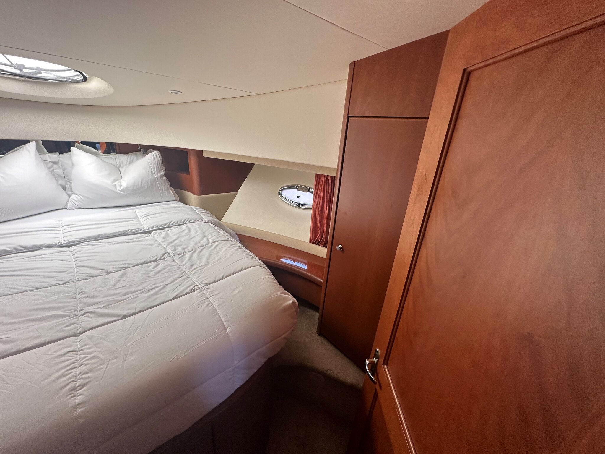Toward the bow is a head (starboard), a guest berth, separate shower stall (port), and a v-berth featuring a TV and two Cedar hanging closets.
