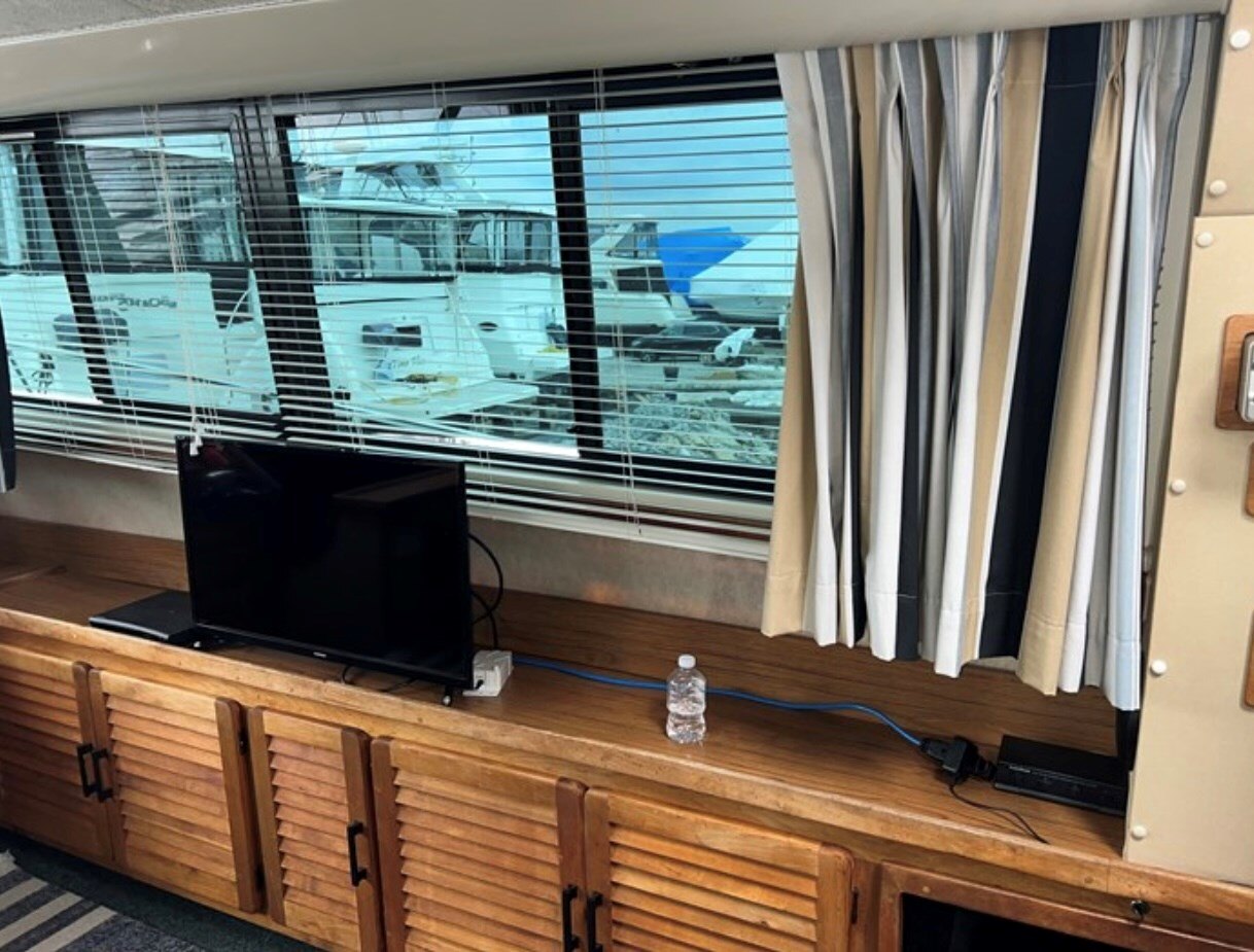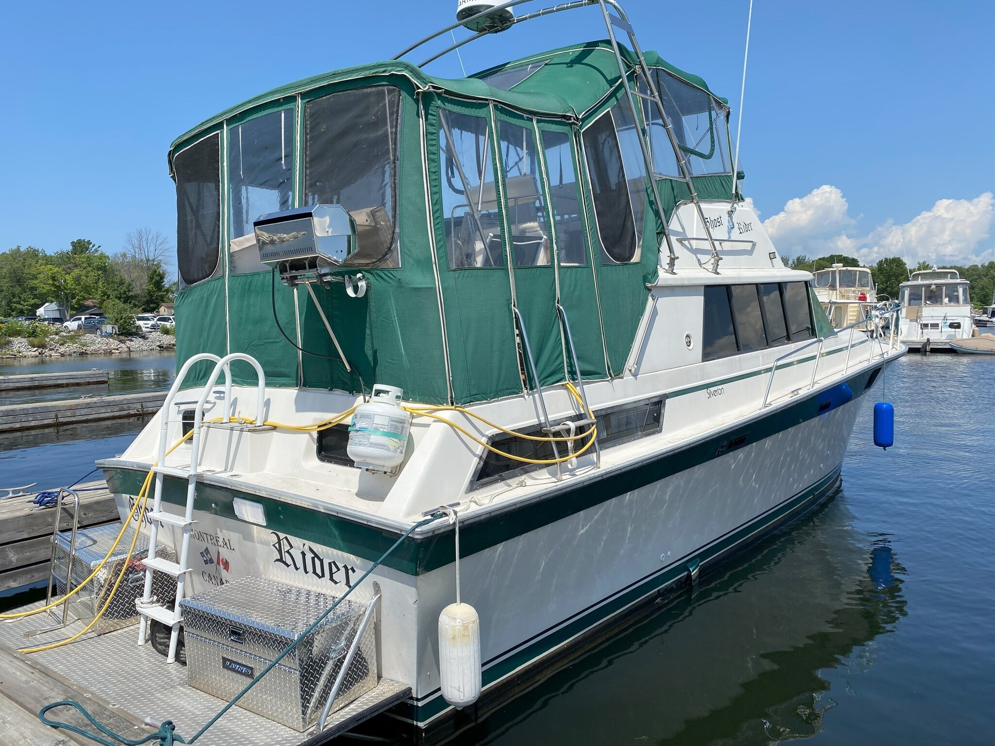 Featuring a roomy salon, full galley, generous aft master stateroom with en-suite head, and a forward V-berth for guests, this boat is ideal for weekend getaways, extended cruising, or even liveaboard adventures. The flybridge and aft deck offer panoramic views and ample space for entertaining, while twin gas engines provide smooth, reliable cruising. Whether you’re a seasoned boater or just starting your nautical journey, this Silverton delivers comfort, style, and classic craftsmanship at an unbeatable value. This is the perfect, affordable weekend getaway or "cottage on the water". Come see this beauty and put your own personal touches on this roomy vessel. Updated electronics, ready for the water!