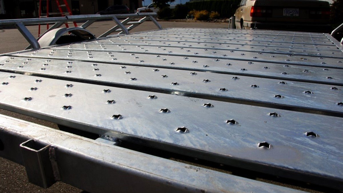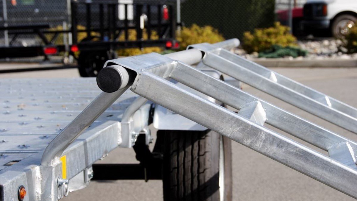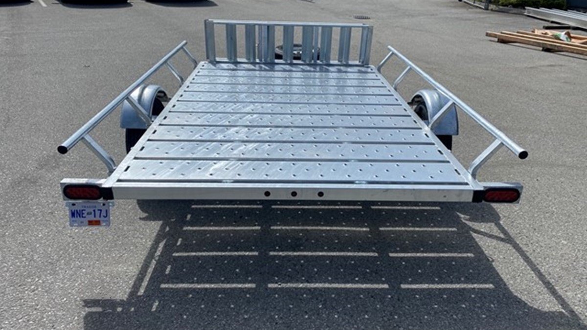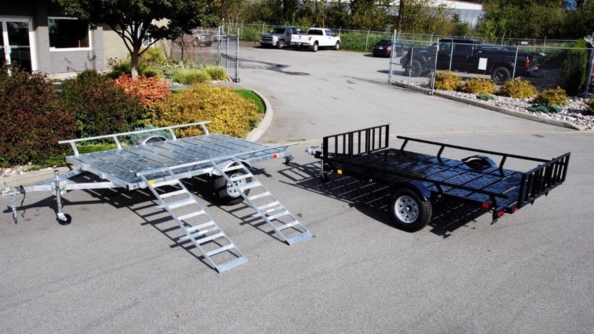 The Marlon Rat-02 Utility Trailer is the upgrade to our bestselling ATV trailer! The Rat-02 comes standard with steel floor decking with punched floor for grip! It is available in powder coated paint or galvanized finish. We have designed this trailer so that the loading ramps, hook on over the rear trailer frame for rear loading or hook onto the side bars for easy side loading of ATV's. The ends of each steel floor panel have notches cut out for securing straps. The loading ramps can be stored on the trailer in the front (pictures show storage of ramps in both front and back but that is no longer available). The Rat-02 complies with Canadian and US D.O.T. requirements.