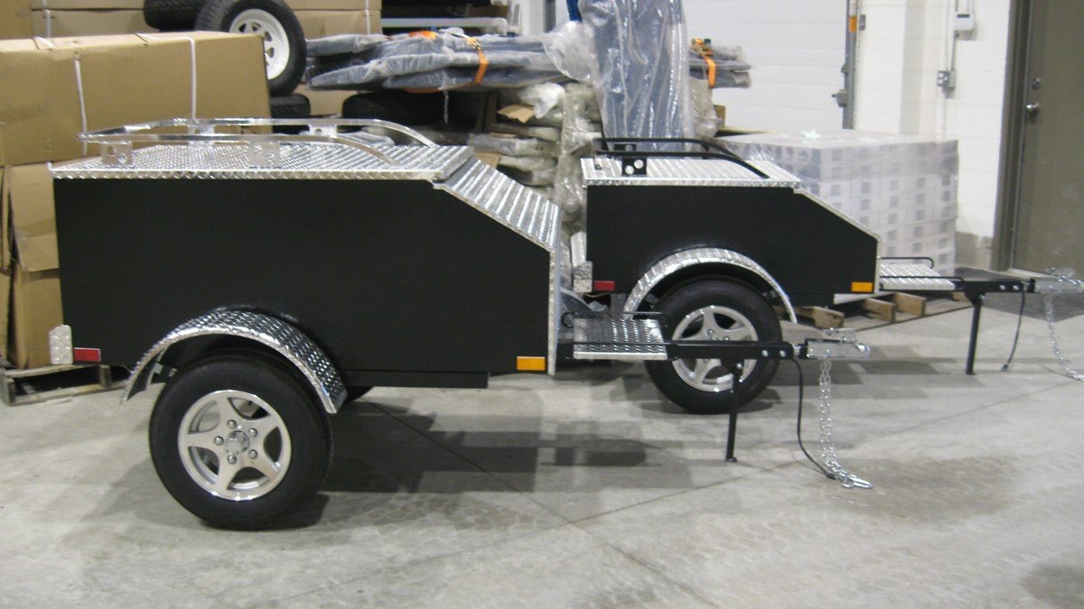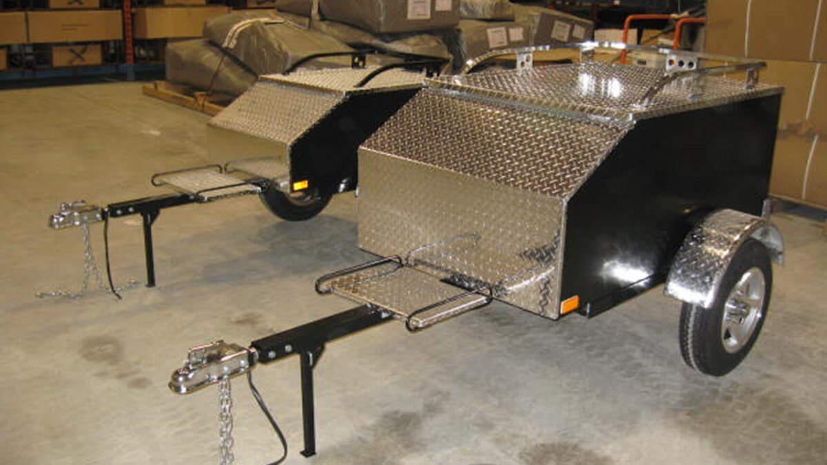 The Marlon AMT Aluminum Motorcycle Trailer is built with an aluminum frame, painted aluminum body with attractive aluminum checker plate accents. Comes with interior carpeted floor & walls also a standard baggage rack.