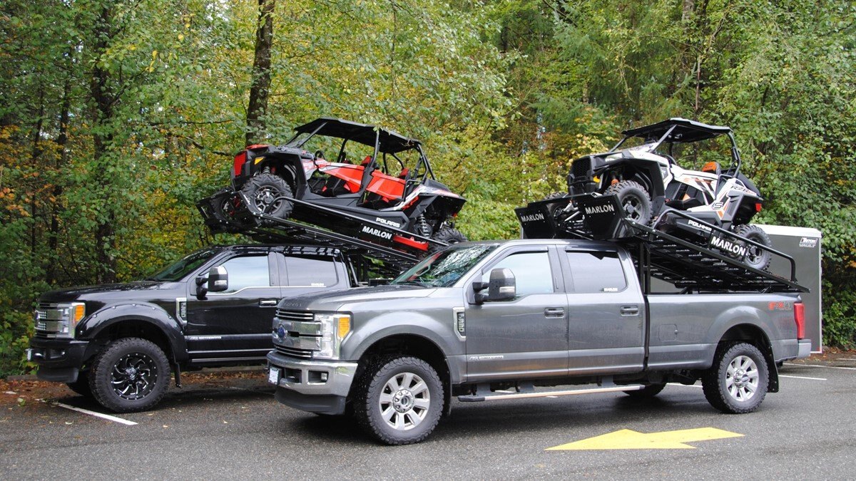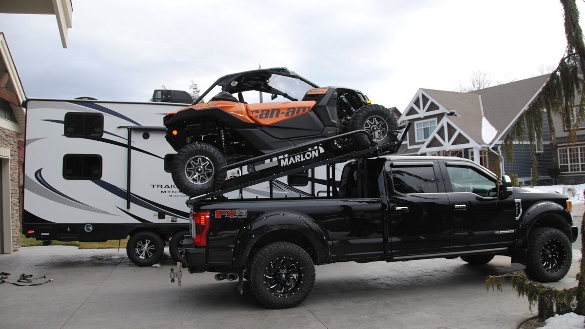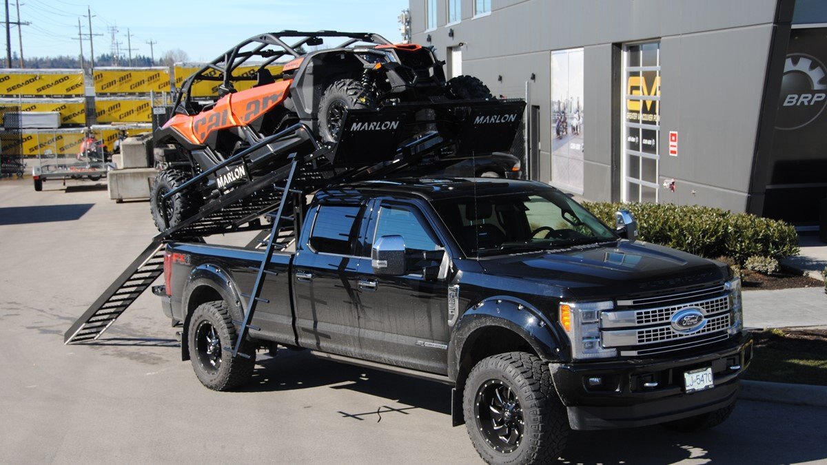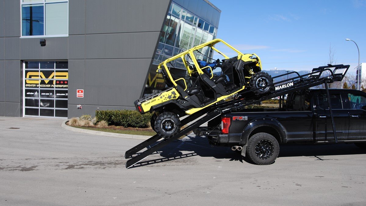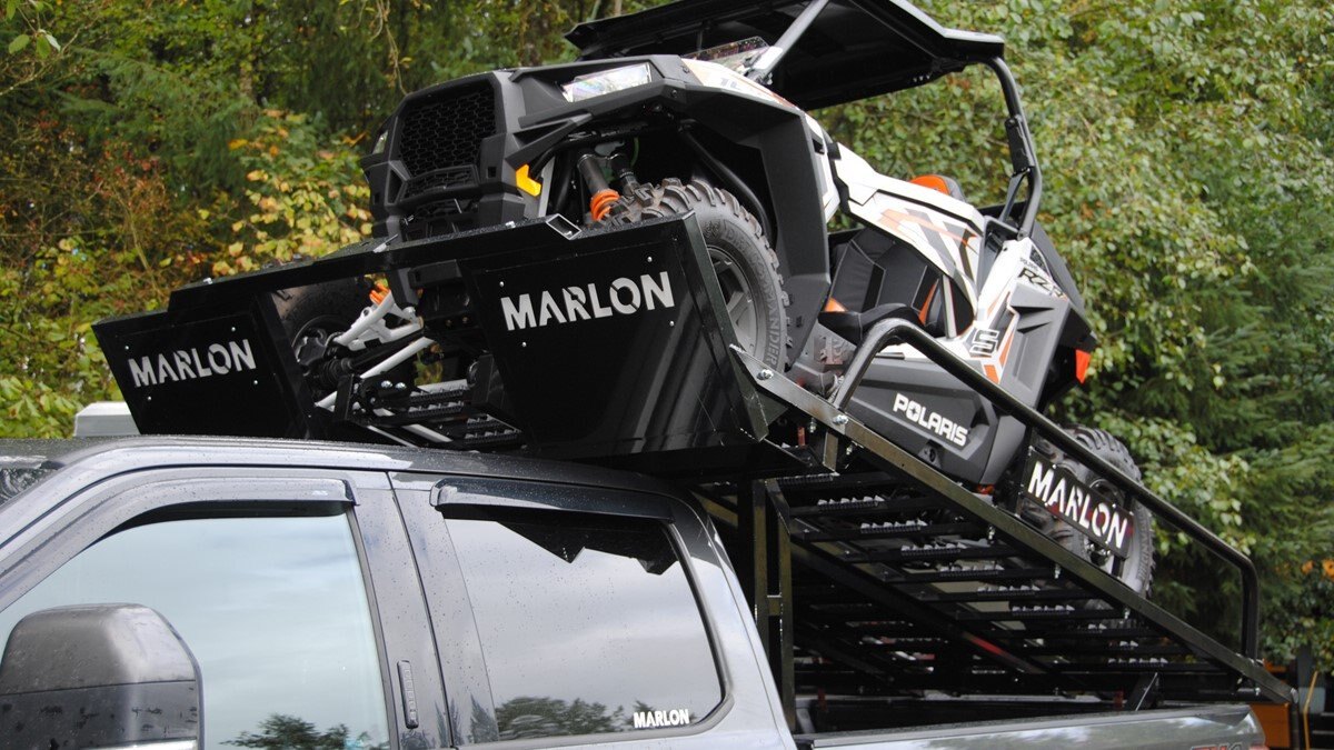 Our latest side by side (SXS) deck was designed to carry 2 and 4 door side by sides up to 120” max length. Now capable of carrying the new 50" wide machines up to the widest factory SXS at 76" with the new addition of the optional SXS Extension you can now carry machines up to 165" in length! The deck comes standard with 10’ ramps that have 4” side safety edges making them safe and secure when loading and unloading. Carry your side by side to the starting line or staging area with your camping trailer in tow. The Marlon Xplore II SXS Deck is specifically designed so you don’t lose any turning radius pulling a trailer. This unique design allows you to easily change from a short box to a long box within minutes. The solid mount winch plate will accommodate a Warrior 3500 xt winch and is designed with a pull point, so you can use your SXS winch if you are equipped. We recommend bolting your Marlon Xplore II SXS Deck to your truck with the supplied mounting kit. Machine securement is made easy with our unique tie down system. We have designed the Marlon Xplore II SXS Deck to have a positive park front tire position which gives the driver a real feel when your machine is loaded to the correct position. All loading ramp and deck ramps have rung protectors on them to assist in traction which is a huge safety feature. When not in use the ramps slide in and are secured under your toy! Now go out and Xplore! |