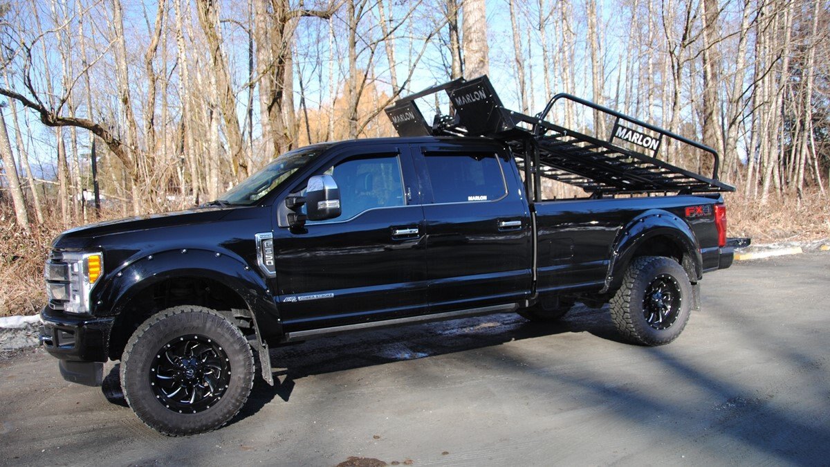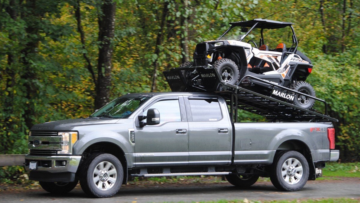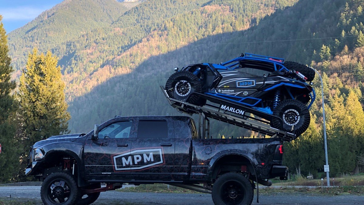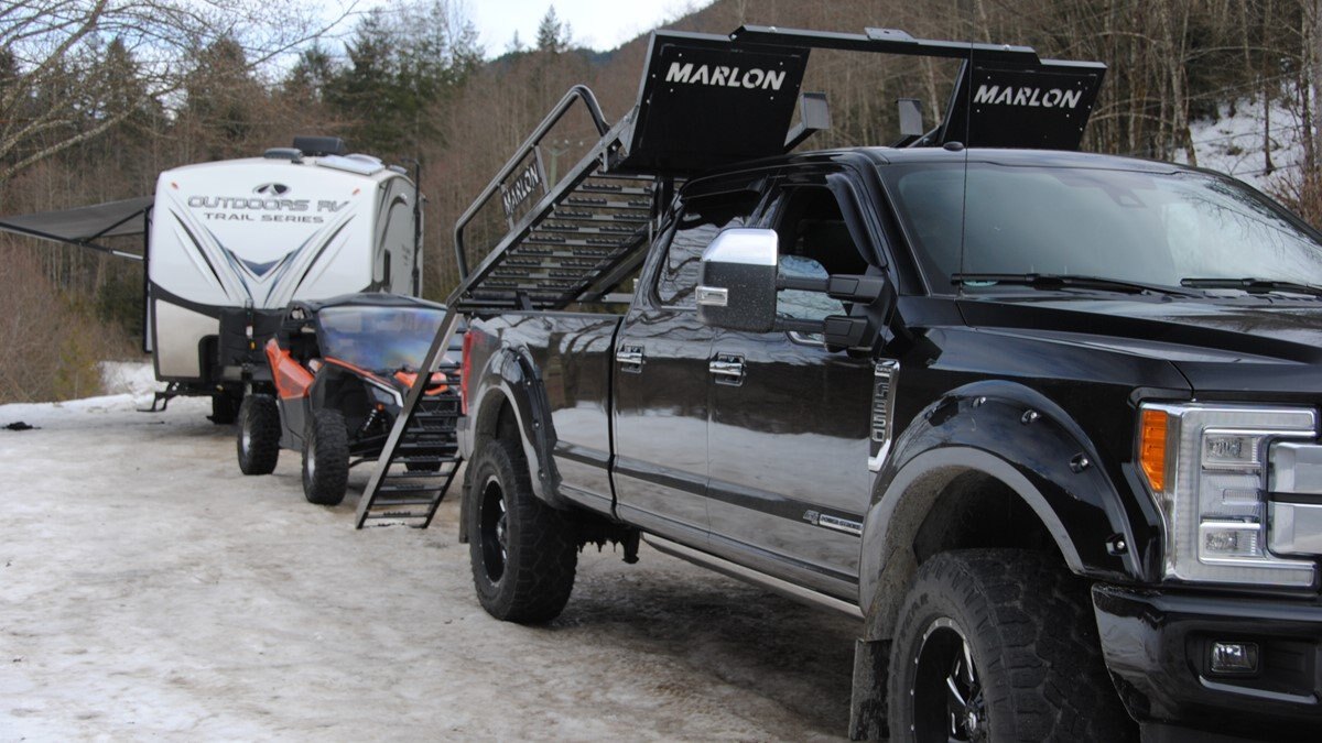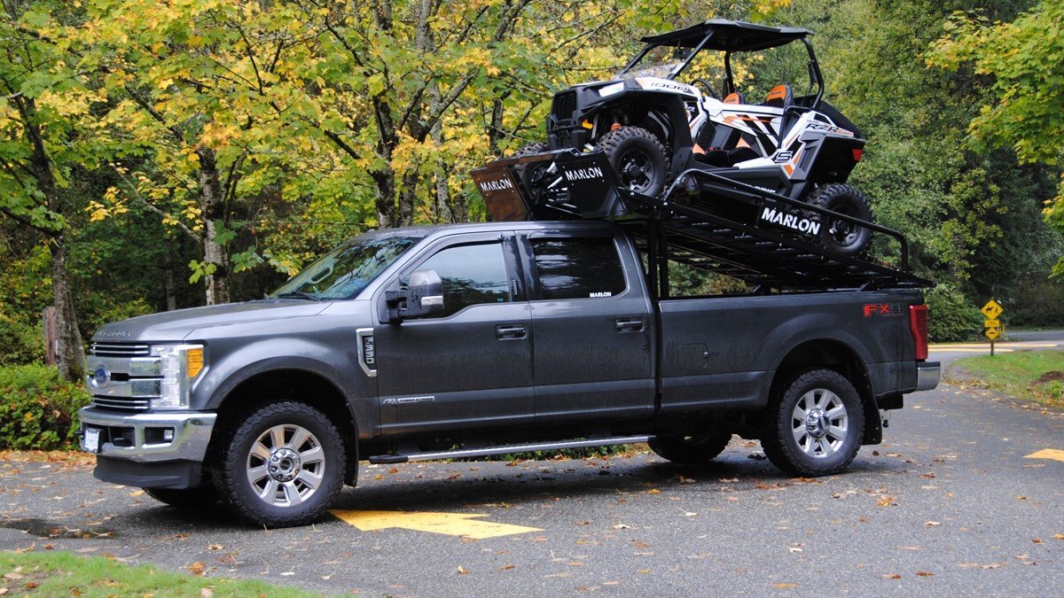 Our latest side by side (SXS) deck was designed to carry 2 and 4 door side by sides up to 120” max length. Now capable of carrying the new 50" wide machines up to the widest factory SXS at 76" with the new addition of the optional SXS Extension you can now carry machines up to 165" in length! The deck comes standard with 10’ ramps that have 4” side safety edges making them safe and secure when loading and unloading. Carry your side by side to the starting line or staging area with your camping trailer in tow. The Marlon Xplore II SXS Deck is specifically designed so you don’t lose any turning radius pulling a trailer. This unique design allows you to easily change from a short box to a long box within minutes. The solid mount winch plate will accommodate a Warrior 3500 xt winch and is designed with a pull point, so you can use your SXS winch if you are equipped. We recommend bolting your Marlon Xplore II SXS Deck to your truck with the supplied mounting kit. Machine securement is made easy with our unique tie down system. We have designed the Marlon Xplore II SXS Deck to have a positive park front tire position which gives the driver a real feel when your machine is loaded to the correct position. All loading ramp and deck ramps have rung protectors on them to assist in traction which is a huge safety feature. When not in use the ramps slide in and are secured under your toy! Now go out and Xplore! |