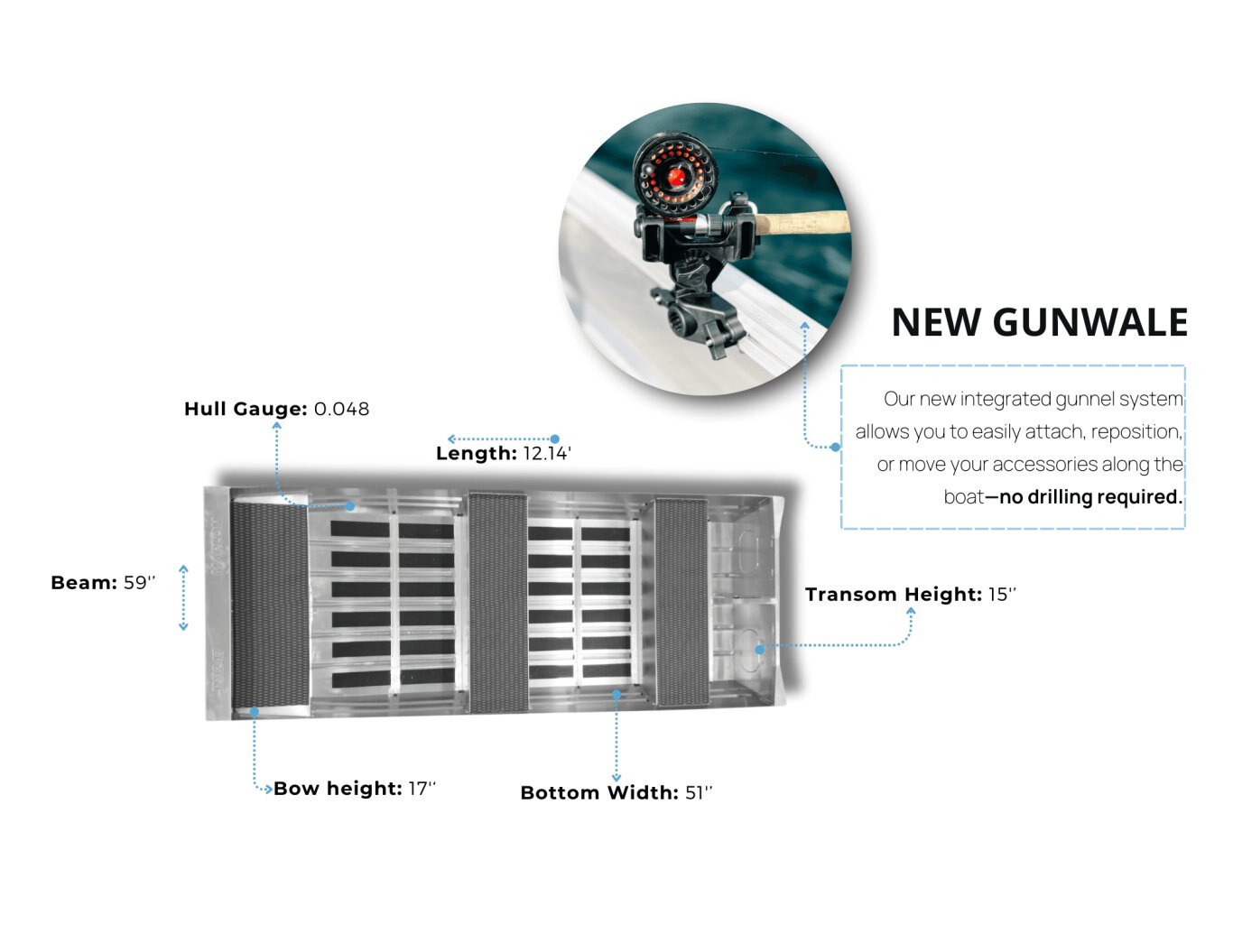 Marlon Jon boats are designed for stability and performance, even in rough conditions. With a 51-inch bottom width for superior balance and smooth handling. Weighing just 132 lbs dry, they’re lightweight and easy to transport, with a max load of 807 lbs Canada / 822 lbs US for all your gear. Perfect for fishing, hunting, or exploring, these boats come equipped with three bench seats, four carrying handles, a heavy-duty transom with supports, and anti-slip floor pads. The high-density EVA seat covers ensure comfort, while the drain plug makes cleanup simple. And now, they’re even better thanks to the new integrated gunwale system, in partnership with Scotty Fishing Products, lets you easily add, reposition, or move your Scotty accessories on the fly—no drilling required. Customize your boat to fit your needs, hassle-free. |